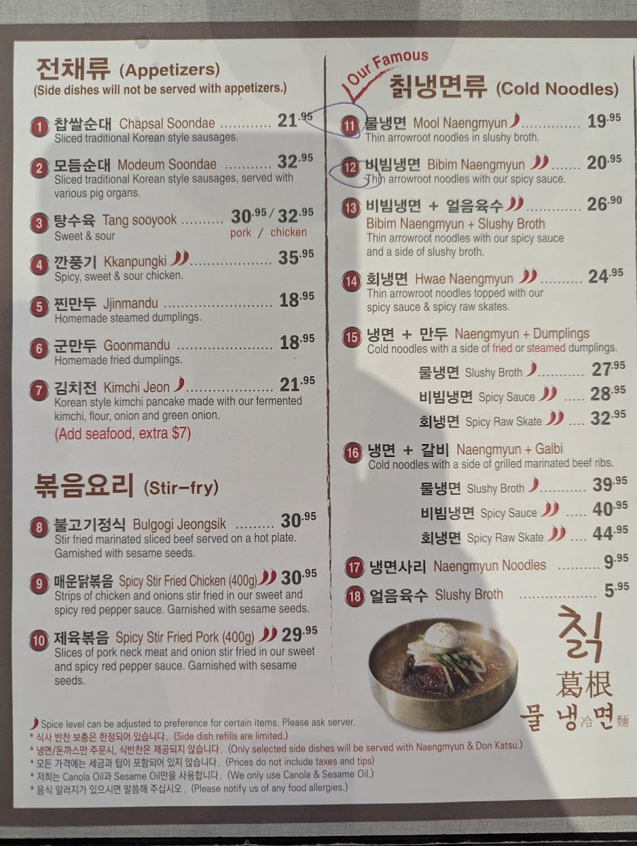 Thin, chewy arrowroot noodles topped with sesame seed oil, pickled daikon, slivers of cucumber, a slice of pear and a hard-boiled egg smothered in our home made spicy/sweet red pepper sauce served with a side of marinated raw skates.